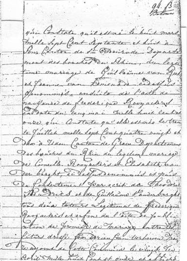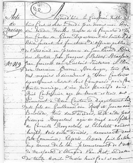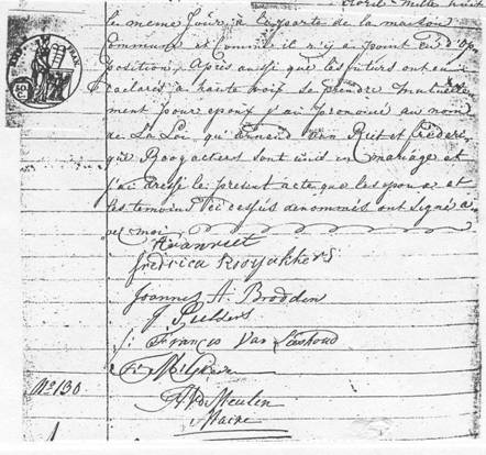 huwelijksakte van Arnoldus van Riet en Frederica Rooyackers.