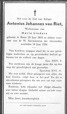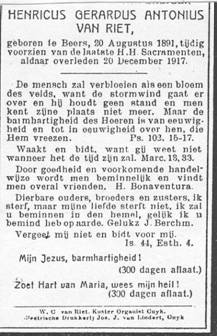 10.031 Hendrikus Gerardus Antonius van Riet, geboren te Beers op 20 augustus 1891 en aldaar op 20 december