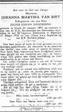 'Petrus Regou' te Maastricht. Johanna overleed te Nijmegen op 27 maart 1932.