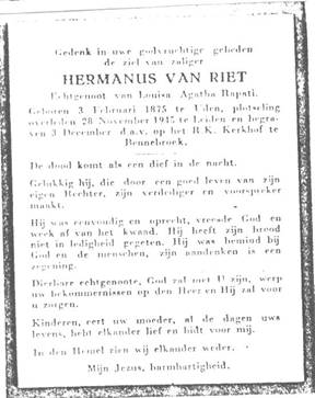 op 28 november 1945. Hij werd begraven op het R.K. kerkhof te Bennebroek.